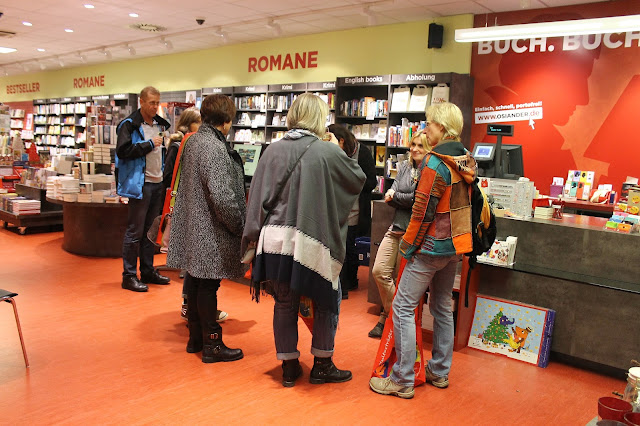 Wie man sieht, war schon zu Beginn einiges Los und ich hatte die Erlaubnis der Gäste ausreichend Fotos beim stöbern zu machen. Mit der Zeit wurde es immer voller, weil auch andere Menschen das schöne Licht in der Buchhandlung entdeckt hatten. Immer vollere Taschen und eine tolle Stimmung ließen den Abend einfach schön werden. Auch Unterhaltungen kamen nicht zu kurz und hier wurden sogar schon Rezepte bei den Kochbüchern ausgetauscht.
