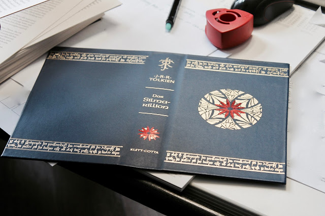 Der neue Silmarillion Band in der Herstellung. Da war er noch mitten in der Überarbeitung und der Umschlag, sowie die Seiten noch lose. Es ist immer wieder spannend, wie viel Zeit und Aufwand in so ein Buch gesteckt wird. Einfach toll, wie viel Mühe sich die Verlage geben ihre Leser glücklich zu machen. Und das spürt man auch. Natürlich geht es auch immer um die Verkaufszahlen, da braucht sich niemand etwas vormachen, aber dennoch ist die Liebe zum Detail jedes Mal zu spüren. Und wenn alle mit der Hand über den Umschlag fahren, denkt niemand an die Zahlen.