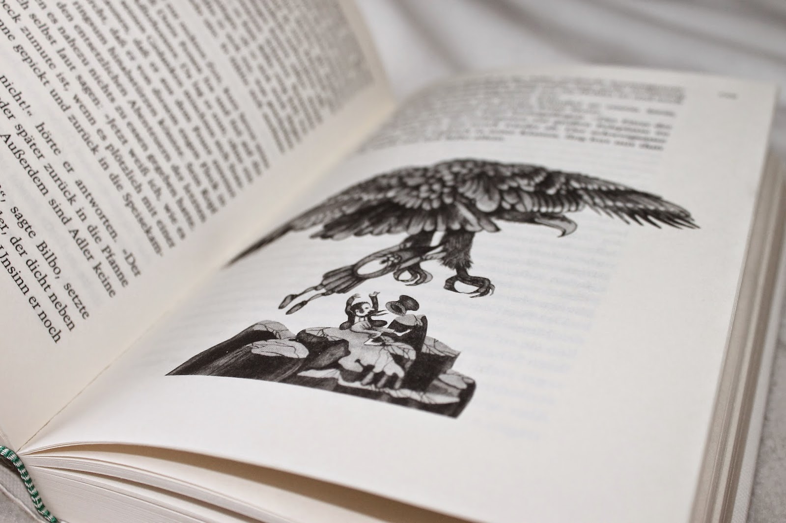 Bilbo gelangt wieder nach draußen und findet nach kurzer Zeit zu den Zwergen und Gandalf zurück. Diese haben ihre gesamte Ausrüstung verloren. Bilbo berichtet von seinem Entkommen, behält das Geheimnis um den Ring und dessen Eigenschaften zunächst für sich und erwirbt sich so den Respekt seiner Gefährten für seine gelungene Flucht. Doch noch sind sie nicht in Sicherheit und müssen vor den Orks fliehen, die sie verfolgen und dabei von Wölfen unterstützt werden. So flüchten sich die Verfolgten auf hohe Kiefern, von wo aus sie durch Feuer heruntergeholt oder verbrannt werden sollen. Doch im letzten Augenblick werden sie durch große Adler gerettet.